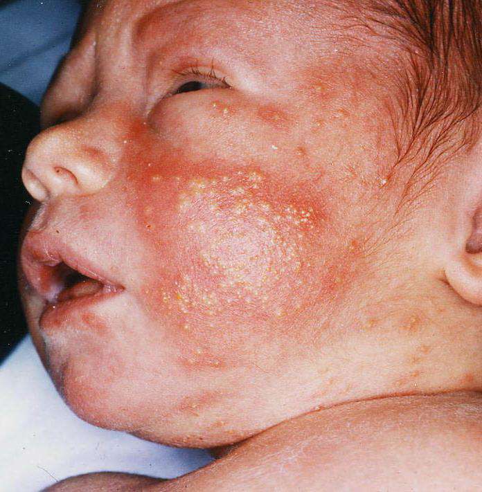 إصابة جلد الطفل حديث الولادة بفيروس الهربس Herpes neonatorum : بسبب إصابة الجهاز التناسلي للأم خلال حمل , و يشفى المرض بشكل كامل إذا تم تطبيق مضادات الفيروس بشكل مبكر , قد تصاب أعضاء الجسم الأخرى غير الجلد.