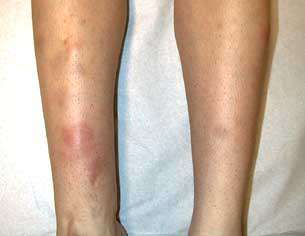 قد تتحول الحمامى العقدة من اللون الأحمر البنفسجي إلى لويحات مزرقة وقد تكون أحياناً مسطحة ويمكن في الحالات الشديدة أن توجد على كامل طول الساقين أو حتى يمكن أن تشمل الذراعين . قد تتطور أفواج جديدة من العقيدات على مدى عدة أسابيع وتترافق أحياناً مع ارتفاع حرارة الطفل و المريض .