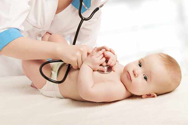 من الصعب تخمين حجم القلب بسبب الاختلاف الكبير في حجم وشكل الصدر عند الرضيع ويجب تحديد موقع القلب لكشف حالة القلب الأيمن، وقد يمكن سماع نفخات عابرة، وقد لا تبدأ الأمراض القلبية الخلقية بنفخات مباشرة، وإنما قد يتأخر ظهور هذه النفخات، حيث أنه في حالة واحدة فقط من أصل 12 حالة تُسمع فيها نفخات قلبية، هي مرض قلبي ولادي فعلاً. وعند الشك بوجود آفة قلبية مهمة يجب إجراء صورة الصدر الشعاعية، وتصوير القلب بالأمواج فوق الصوتية وتخطيط القلب الكهربائي. يتراوح عدد النبضات القلبية بين 90/دقيقة عند الرضيع النائم إلى 180/دقيقة خلال النشاط، ويمكن عَدّ النبضات القلبية في حالة تسرع القلب فوق البطيني بالمرقاب القلبي أو بتصوير القلب بالإيكو بشكل أفضل من السماع بالأذن. قد يتعرض كل من الرضع الخدج والذين سرعة نبضهم الاعتيادية هي 140-150/دقيقة لبطء القلب الجيبي المفاجئ ويجب جس النبض في الطرفين العلوي والسفلي لكشف حالة تضيق برزخ الأبهر وذلك عند قبول وتخريج الرضع من الحاضنة.